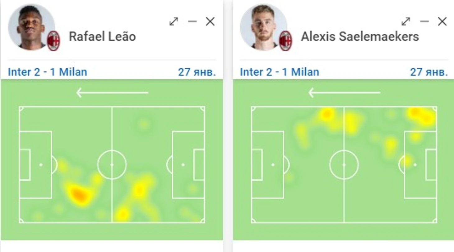 Другим вариантом для продвижения мяча оставались фланги, то есть через крайних защитников Эрнандеса и Далота, которые располагались в высоких позициях. Чаще всего использовался левый фланг, где играет Тео. При получении мяч от центрального защитника срабатывало ложное забегание Леау за спину фланговому защитнику «Интера». За ним стягивался Барелла, так как Дармиан выдвигался на Эрнандеса при получении мяча. Таким образом, из-за рывка Леау для Тео освобождалось пространство в полуфланге с возможностью на дриблинге продвинуть мяч, либо сделать заброс из глубины на центрального нападающего.