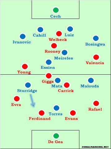 В матче на «Олд Траффорд» «Челси» прибавил после перерыва, благодаря тому, что они перешли на схему 4-2-1-3, в которой Хуан Мата действовал под Николя Анелька, Даниэлем Старриджем и Фернандо Торресом. Очень вероятно, что именно это вдохновило Виллаша-Боаша на отход от его любимых 4-3-3 во вчерашнем матче.