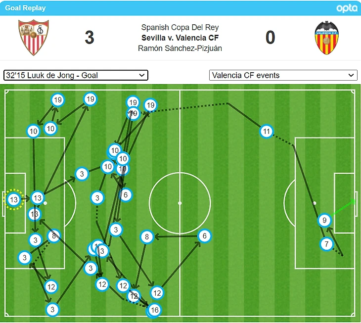 • Практически весь розыгрыш ушел на то, чтобы выйти из-под прессинга «Валенсии». Атакующее трио «Севильи» (Мунир-Сусо-Де Йонг) в первые 30 пасов не трогало мяч, зато когда Маркосу Акунье организовали свободную зону и он убежал в нападение, вся тройка быстро сообразила гол.