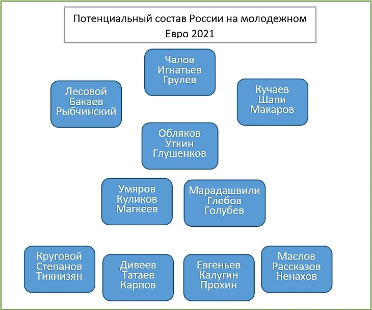 Давайте посмотрим, кто может поехать на Молодежный чемпионат Европы 2021, который начнется уже в марте этого года. Оказывается, что в такую сборную у нас набирается аж три состава игроков, причем все заиграны за клубы РПЛ. Ситуация удивительная и небывалая.