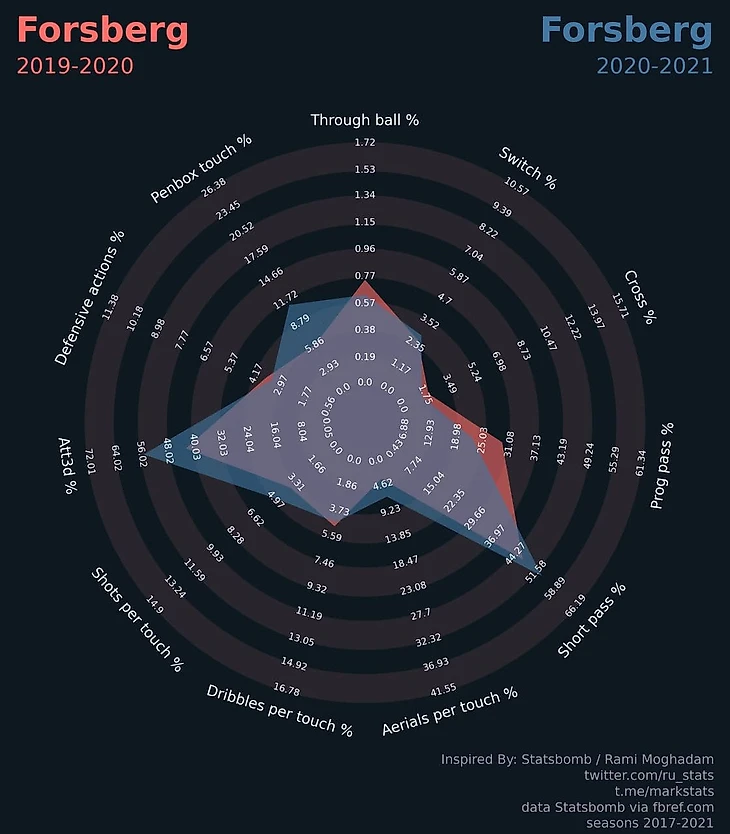 Его эволюцию довольно хорошо отображает статистика. На графике ниже видно изменения стиля Форсберга в этом сезоне в сравнении с прошлым. Резко выделяются рост процента касаний в штрафной и в финальной трети, также достаточно повысился процент ударов на касания и процент коротких пасов. Если же говорить о заметных падениях показателей, то выделяются пасы с продвижением.