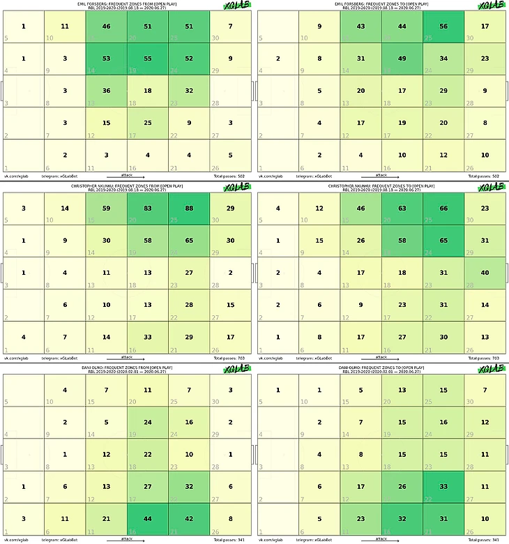 Однако, все-таки еще важнее тут помнить про Кристофера Нкунку, который к началу второго кругу уже прошел период адаптации и отлично чувствовал себя в игре команды, пусть и не всегда выдавал необходимую стабильность. Ниже представлены диаграммы, из каких (слева) и в какие (справа) зоны пасовали в прошлом сезоне Форсберг, Нкунку и Ольмо. Можно понять, почему про Кристо стоит говорить как про конкурента Эмиля, пусть даже это и не соотносимые в полной мере игроки.