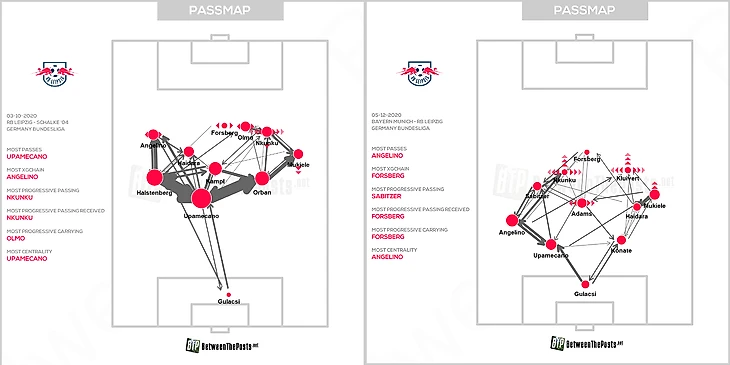 Первые задатки идеи использования Эмиля в центре нападения в роли, близкой к ложной девятке, появились только в третьем туре против «Шальке» (ниже – левая карта средних позиций и передач). Настоящим же пиком этой новой роли стал матч против «Баварии» (ниже – правая карта средних позиций и передач), где вся система нападения во многом функционировала благодаря Форсбергу и быстрым флангам, что помогло «Лейпцигу» впервые забить на «Альянц Арене» – и сразу три мяча. Форсберг тогда и отдал голевой пас, и забил сам.