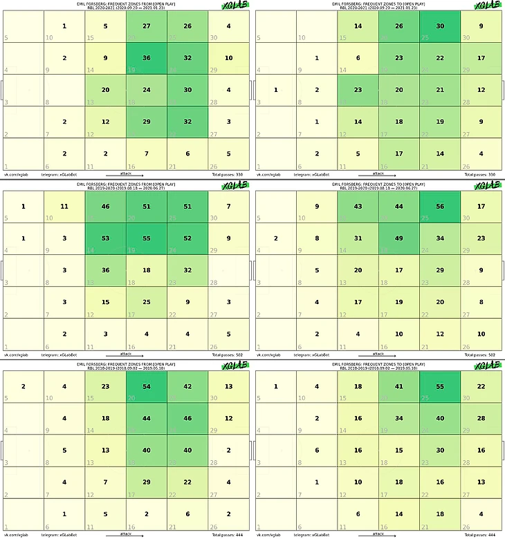 «Эмиль очень много двигается, он очень подвижный, из-за чего его сложно поймать», – описывал его игру в ноябре Нагельсманн. Ниже представлены диаграммы, из каких (слева) и в какие (справа) зоны пасовал Форсберг в сезонах 2020/21, 2019/20, 2018/19. Уже тут можно видеть гораздо более сильное смещение в центр, пусть неизбежный акцент на левом фланге и остается.