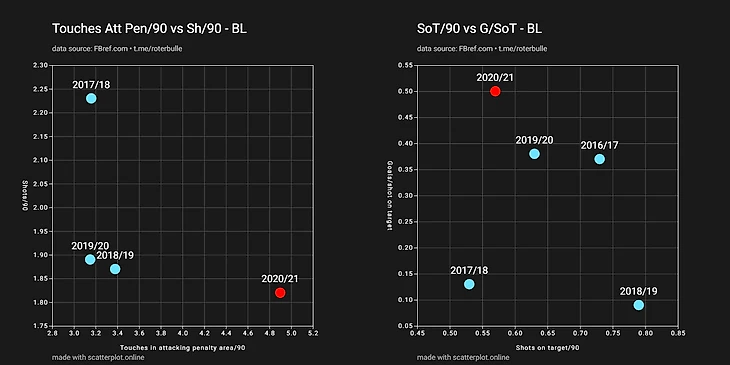 Но можно понять, почему Форсберг повторяет, что он «ненастоящий нападающий». Даже при его достойной (по меркам клуба, за который в текущем сезоне Бундеслиги уже 15 разных человек забивали голы) эффективности он, что было видно уже по npxG выше, не так много бьет. Более того, он бьет даже меньше, чем в прошлых сезонах.