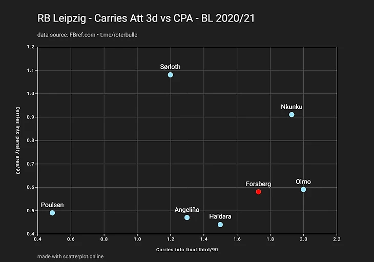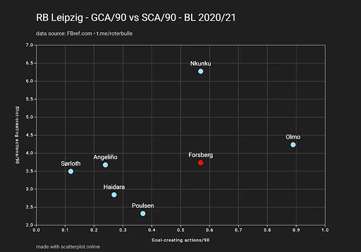 Здесь же стоит отметить, что Форсберг – один из превосходящих ожидания игроков в «Лейпциге», в клубе, для которого проблема реализации была больной темой весь 2020 год. Выше него при вычислении разницы между npxG и реальными голами только Юссуф Поульсен. Помимо них двоих, только у Анхелиньо из представленных на графике ниже игроков разница в плюсе.