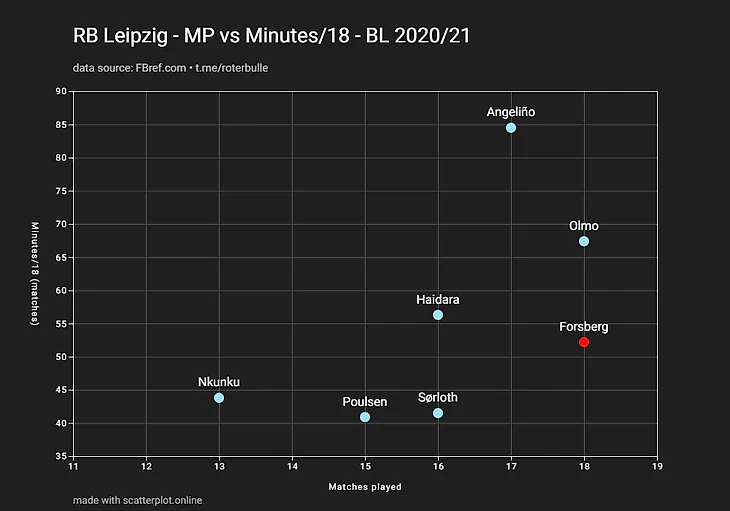 Да, Нагельсманн называл имя Форсберга в числе тех, кто должен брать на себя больше ответственности, но под этим вполне могли изначально подразумеваться выходы в Лиге чемпионов на последних минутах для того, что он умеет лучше всего – для важных голов. Сложно было предвидеть, что Форсберг будет выходить в абсолютно каждом матче во всех турнирах.