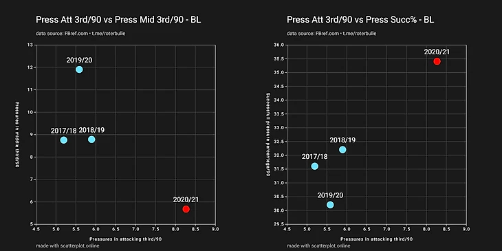 Еще один важный элемент игры «Лейпцига» – прессинг. Если посмотреть на количество прессинг-действий Форсберга в финальной трети к количеству прессинг-действий в средней (левый график), то тут будет очевидный и объяснимый сдвиг показателей этого сезона в сторону атакующей трети. Интересно тут посмотреть и на количество прессинг-действий в финальной третий к проценту успешных прессинг-действий (правый график).
