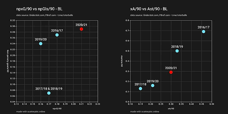 Еще одной наглядной иллюстрацией смещения акцентов в его игре могут служить графики со сравнением показателей Форсберга относительно голов и ассистов в разных сезонах. Слева – npxG (ожидаемые голы без учета пенальти) к реальным голам (без учета пенальти), справа – xA (ожидаемые ассисты) к реальным ассистам.