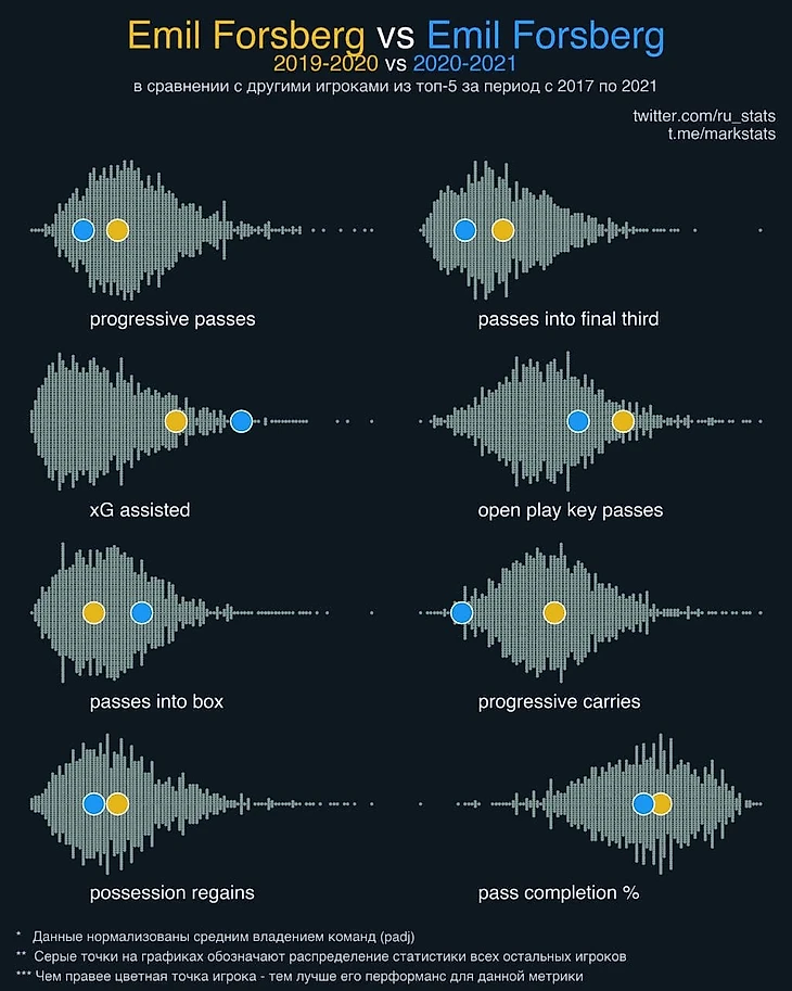 В качестве подведения черты под выводами об изменениях, которые произошли с Форсбергом в этом сезоне и позволили ему вновь стать действительно важным игроком команды, можно использовать сравнение перформанса прошлого сезона и этого. Да, есть неизбежное падение того, что касается продвижения мяча, но показатели работы в завершающей стадии выросли. А показатель xA пусть и не вернулся на высоты сезона-2016/17, но значительно приблизился к топ-уровню.