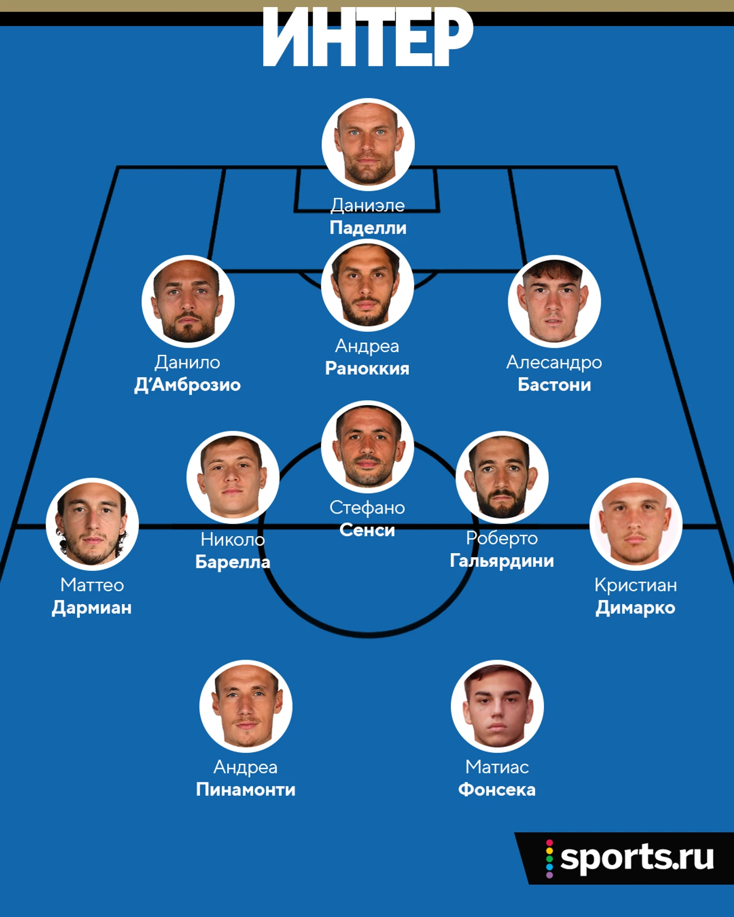 Большинство ключевых игроков «Интера» – иностранцы. Лидерами команды станут Николо Барелла и, вернувшийся в основу, Андреа Раноккия. Позиции левого латераля займет кто-то из игроков Примаверы, предположим, что эту позицию займет Кристиан Димарко. Аналогично из молодежки в основу подтянутся Пинамонти и Фонсека. Остальные позиции займут опытные игроки резерва.