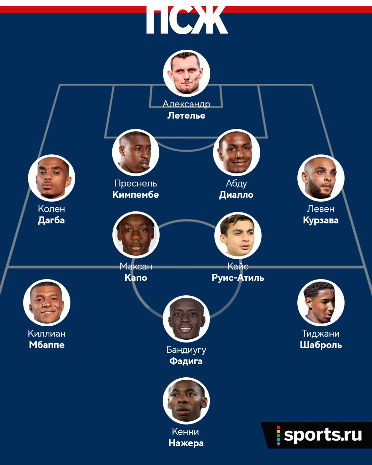 В итоге у нового Парижа в составе голкипер Летелье, защитники Кимпембе, Диалло и Курзава, а на одном из флангов атаки Мбаппе. Остальные позиции займут игроки молодежки.