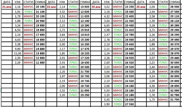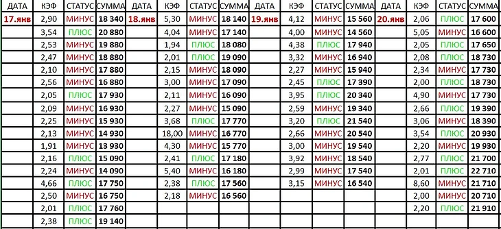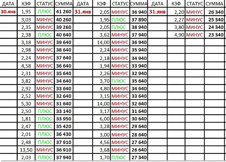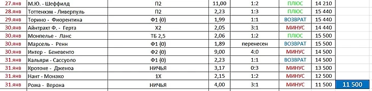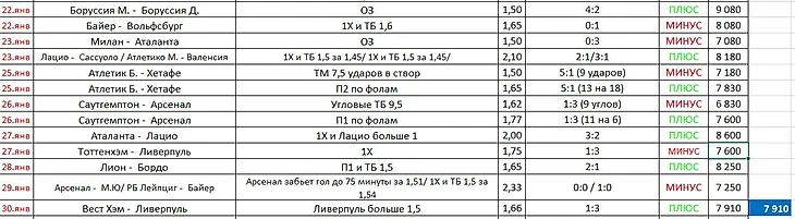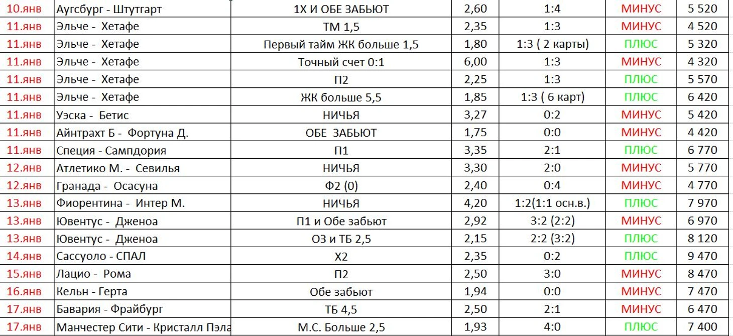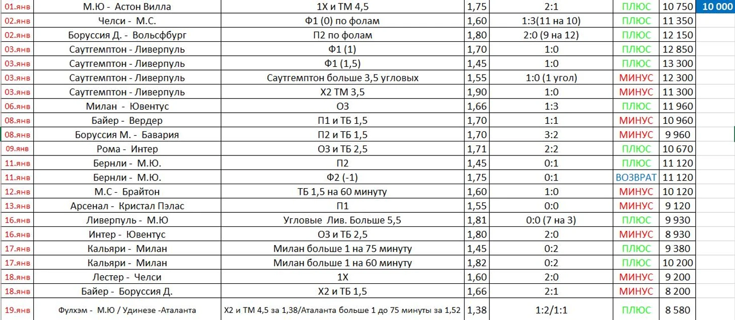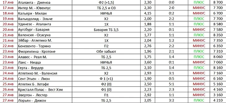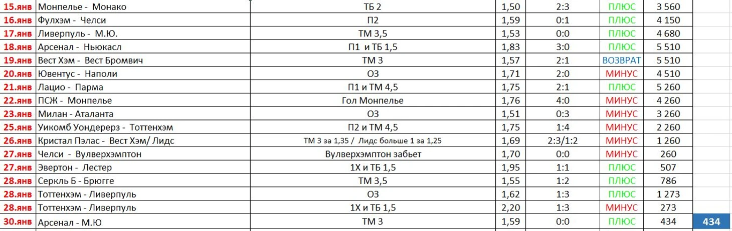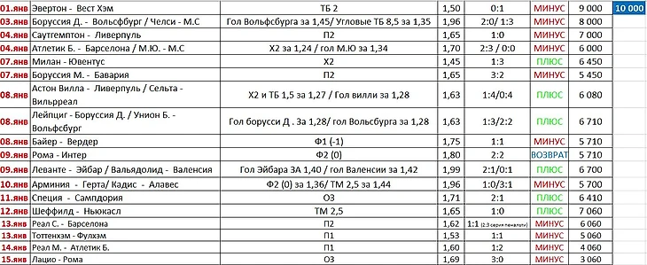 Старт месяца начался с минусов. И за половину его, ситуация не изменилась. Минусов невооруженным взглядом больше чем плюсов, а с учетом, какие коэффициенты любит задействовать в своих прогнозах автор канала, банк будет минусовым, да даже в том случае, если минусы и плюсы выйдут поровну. И еще один интересный момент. Экспресс от 3 января, с участием Вольсбурга и матча Челси - Манчестер сити, из двух прогнозов не зашел не один, Вольфсбург забить не смог, а в матче АПЛ подать успели всего восемь угловых. Это наталкивает на мысль о ставках на обратных исход.
