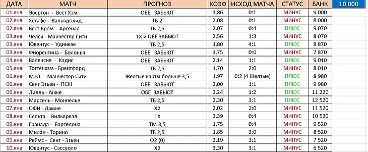 Десять дней прошло, банк в минусе, но стоит отметить, что в отличие от предыдущего прогнозиста, самый минимальный коэффициент берется в 1,70.