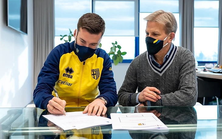 12:33 – А вот и первая новость с пометкой «официально». Владелец «Пармы» Кайл Краузе в своём Твиттере опубликовал фото с подписания контракта с Маттией Бани, ранее выступавшим за «Дженоа»: