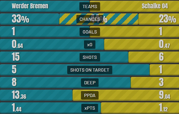 Очко надежды Несмотря на то что второй круг только начался, лишь настоящее чудо может помочь «Шальке» сохранить прописку в элите немецкого футбола. Команда за весь сезон пока одержала всего лишь одну победу, зато звонко хлопнула дверью, разгромив «Хоффенхайм» со счетом 4:0). «Бременские музыканты» барахтаются в середине турнирной таблице, и, судя по всему, приоритетной задачей в сезоне для них будет сохранение прописки. Поэтому можно предполагать, что ничейный исход в игре против команды из Гельзенкирхена их вполне устроил, тем более по ходу игры им пришлось отыгрываться.