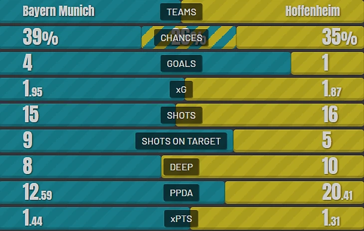 Зеркальные В матче первого круга «сельчане» сотворили суперсенсацию, «вырубив» мюнхенцев со счетом 4:1. Однако, когда речь заходит о «Баварии» вопрос всегда после такого остается только один: когда придется платить по счетам? Такая команда с «инстинктом убийцы», которая все помнит, всегда старается сгладить подобные репутационные удары при первой возможности. При этом «Хоффенхайм» набрал также невероятный ход и в двух турах ранее смог разгромно с одинаковым счетом 3:0 обыграть «Кельн» и «Герту». Он показал неплохую игру, однако бороться против суперчемпиона гостям было трудно. Даже гол в раздевалку от хорвата Андрея Крамарича, который стреляет по-полной и за три игры забил пять мячей, никак не помог.