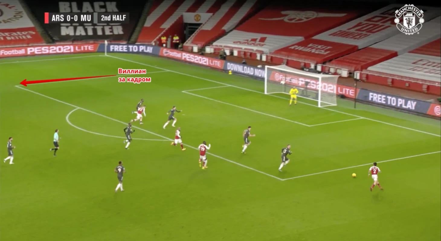 Но мяч перелетел через Магуайра, Виктор пошел страховать, АВБ пошёл страховать Виктора — в итоге Виллиан свободен. Подобная ситуация — свободный игрок соперника в широкой позиции — довольно часто происходит у ворот «Юнайтед». Почему?
