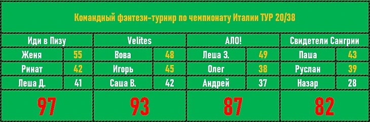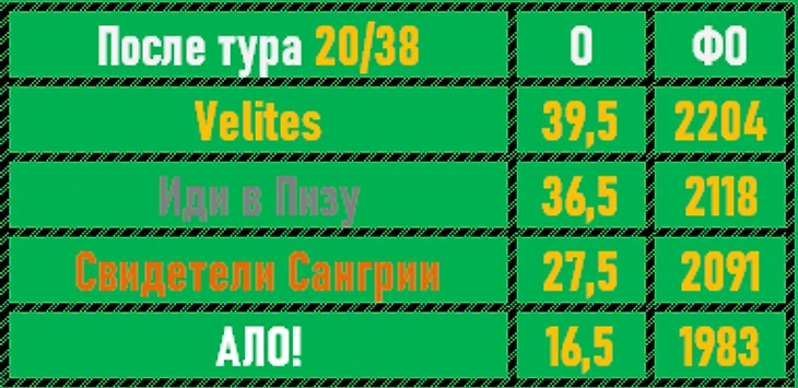 Тур 20 подтвердил никчемность СС, в то время как ребята из Иди в Пизу забрались на самый верх. Разрывы маленькие, напряжение нарастает.