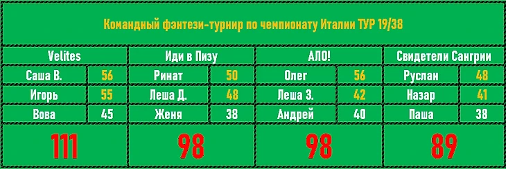 Уверенная победа Velites в очередном туре нашего чемпионата. Еще три балла в равной пропорции поделили команды Иди в Пизу и АЛО!, Свидетели Сангрии отгребли слегка от всех.