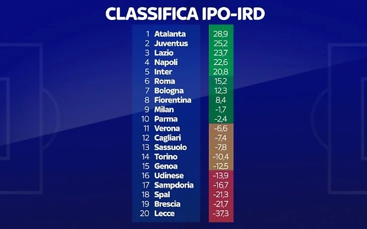 Выше - прошлосезонный рейтинг Серии А, основанный на разнице IPO/IRD. Не оценка заслуг, а идея сравнить, сколько команда создаёт и сколько рискует. Здесь лидирует Аталанта, как и другие "зеленые" команды, производя гораздо больше чем рискуя. Сравнивая этот рейтинг с реальным, можно увидеть, что есть команды (Наполи и Болонья), которые создавали гораздо меньше, чем то, что производится.