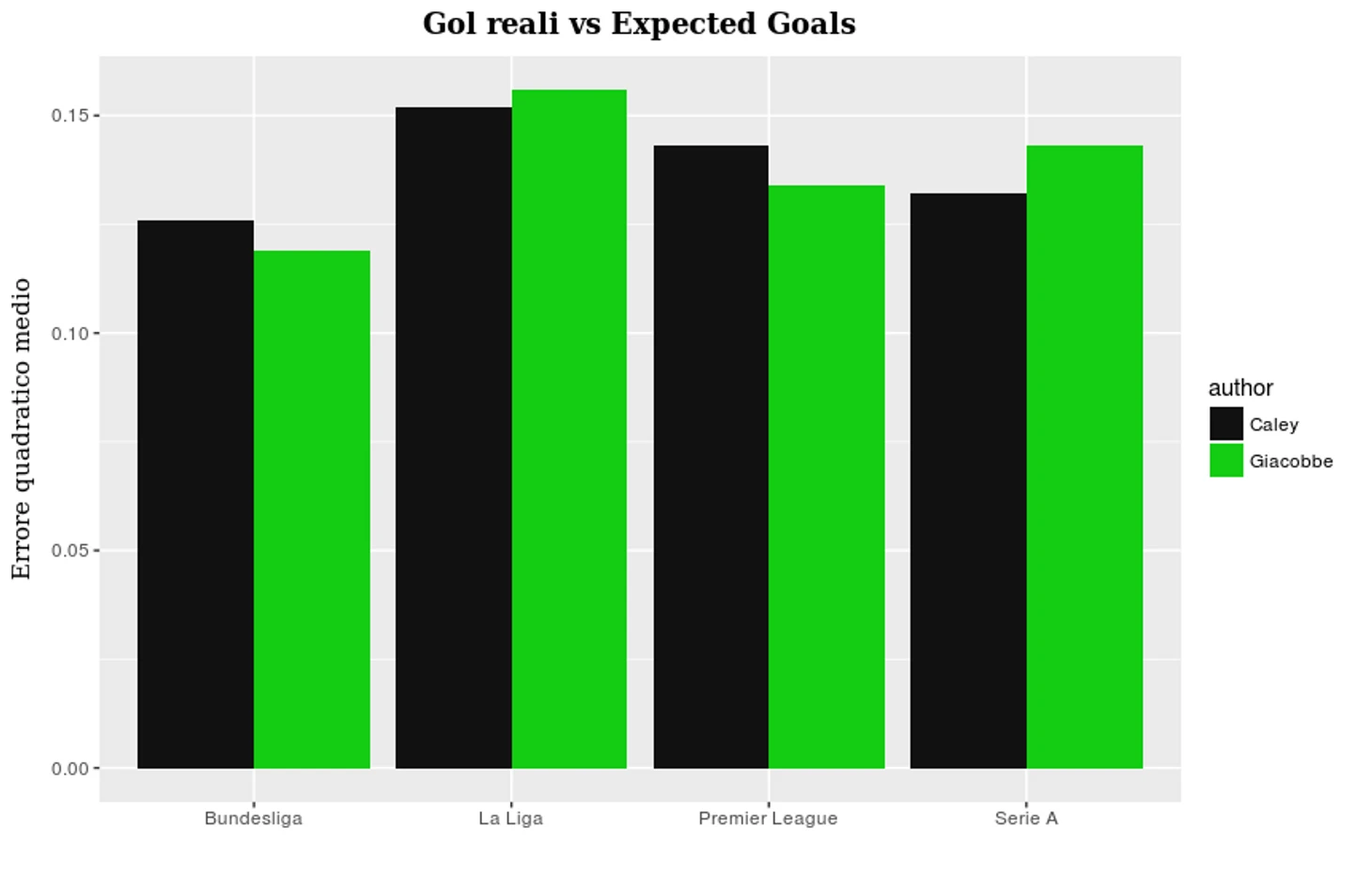 Среди публичных моделей детище Кейли до сих было самы надежным из всех, даже с точки зрения прогнозирования будущих результатов команды. По этой причине, чтобы проверить надежность модели xG UU, Альфредо сравнил сами модели. Упрощая, автор хG UU вычислил среднюю разницу реальных голов и ожидаемых в обеих метриках, на основании результатов отдельно взятых 380 игр.