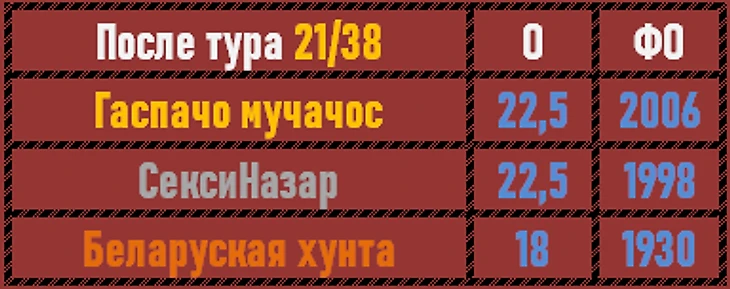 Очередной тур ознаменовался красивой "круглой" победой Беларуской хунты. Ребята выбили страйк благодаря прекрасной игре Леши З., который показал чудесный результат - 54 балла.