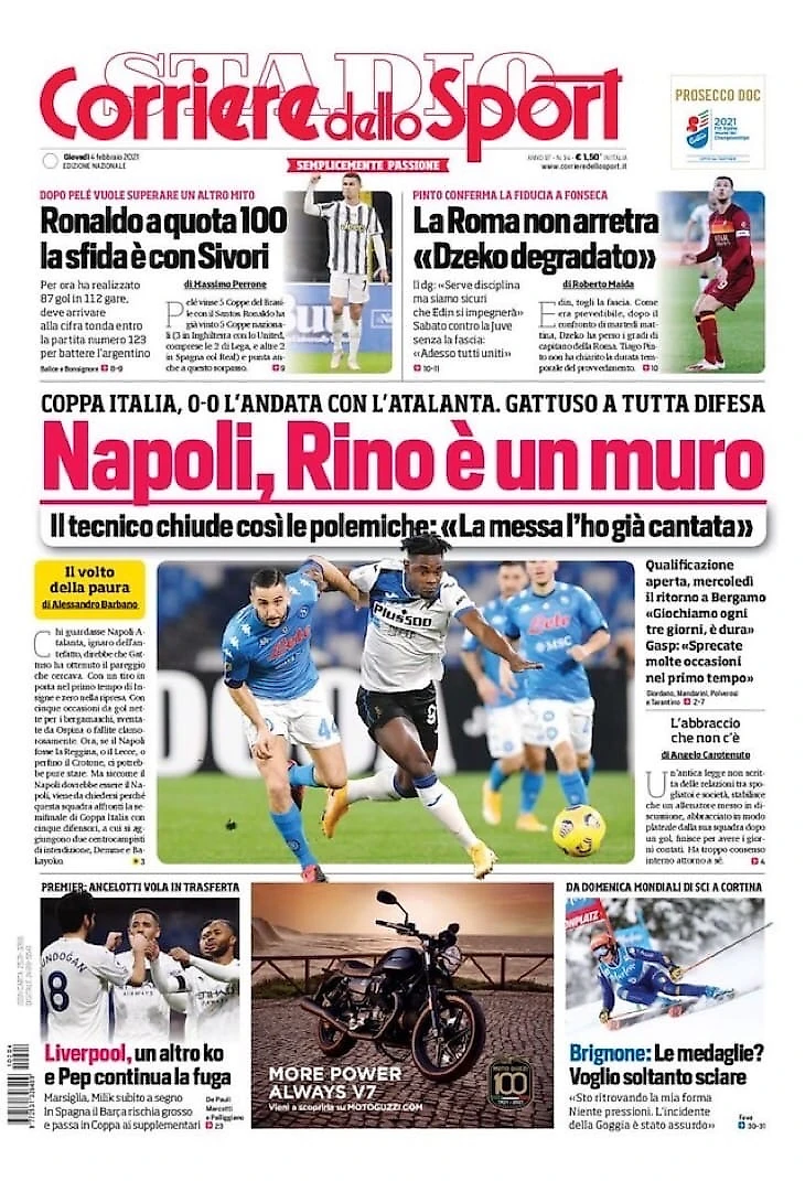 В первом матче полуфинала Кубка Италии в Неаполе «Аталанта» создала много моментов, однако не материализовала их и не воспользовалась невероятным шансом Толои. Команда Гаттузо никогда не была опасна. Ответный матч в среду 10 февраля.