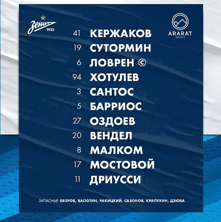 "Зенит" легко разобрался в первом контрольном матче второго сбора в Дубае с "Араратом-Армении". В старте пару Ловрену составил молодой Хотулев. А так состав был максимально приближен к боевому: Кержакову, Сутормин справа, Сантос слева, опорники Барриос и Оздоев, а за тики таку в финальной трети ответили Малком, Мостовой и Дриусси. О, Вендел где-то потерялся, но он точно был.