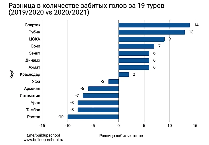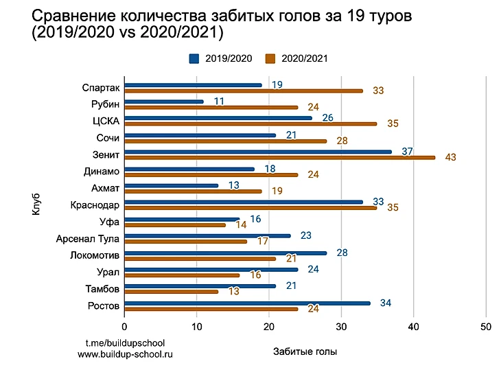 На прошлой неделе сравнивал динамику набора очков к зимней паузе в сезонах 19/20 и 20/21. Среди лидеров были Сочи, Спартак и Рубин. Сегодня сравниваем эти же периоды, но уже смотрим на количество забитых голов.