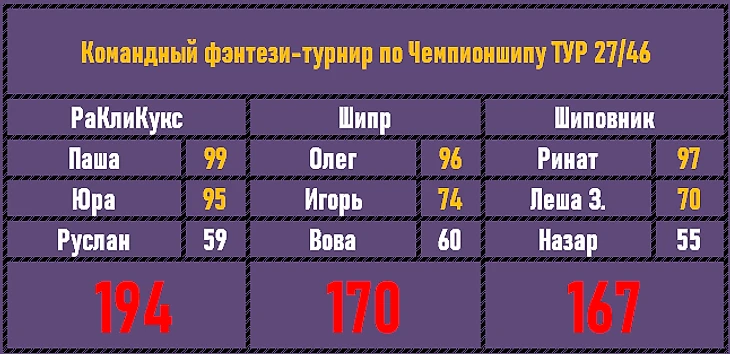 Заветную сотню за тур чуть не разменяли 4 участника. Что поделать, если половина из них играет за РАКлиКукс?)) Этим и обусловлен их такой значительный отрыв от конкурентов. А вот в жестачайшэй борьбе за второе место удачливее оказался Шипр, всего 3 очка преимущества над бедовым и изжившим себя Шиповником.