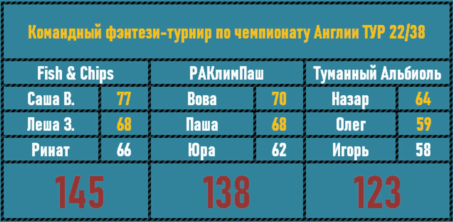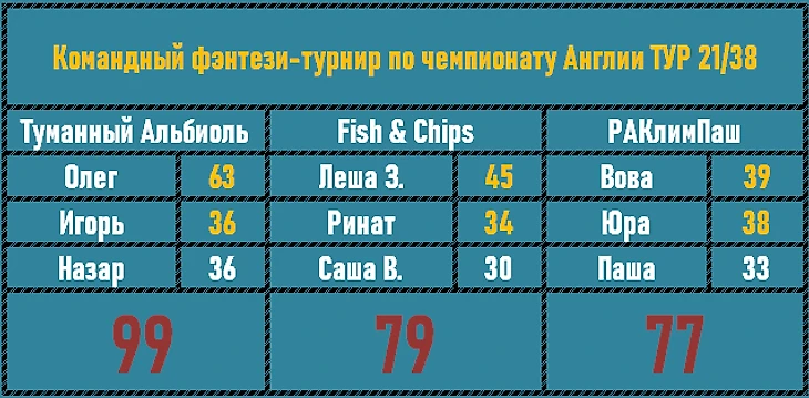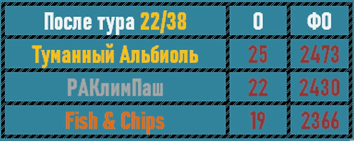 7 подряд туров тянулась печальная серия Fish&Chips. 7 безнадежных третьих мест... 21 тур принес, наконец, серебряную позицию. Надеемся, это пойдет команде на пользу, взбодрит всех участников, и коллектив станет на победные рельсы. Туманный Альбиоль даже в таком низовом туре почти смог выбить 100 баллов и заслуженно победил.