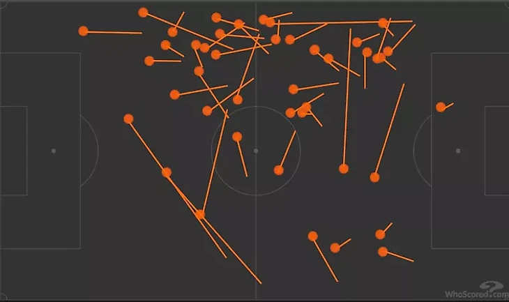 Взгляните на карту передач ван де Бека, на которой показаны только его передачи вперед против Уотфорда.