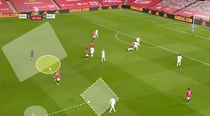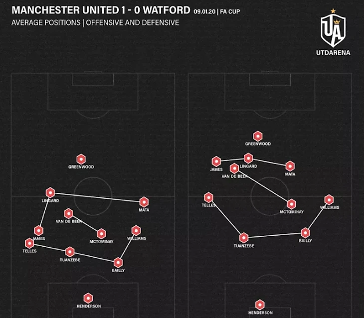 Мата - игрок, который любит смещаться в центр, поэтому неудивительно, что он часто прикрывал рывки Ван де Бека. Компромисс заключается в том, что Ван де Бек продвигался вперед по центру, а без правого нападающего, это означало, что Мейсон Гринвуд часто направлялся на правый фланг, чтобы искать мяч, что как бы сводит на нет цель Гринвуда, начинающего под номером 9.