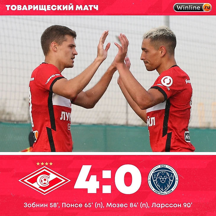 «Спартак» — «Рига» (Латвия) — 4:0 (0:0) Дубай. Поле комплекса Jebel Ali. 07.02. Судья: Д. Димитриевич (Сербия). «Спартак»: Селихов (Ребров, 46), Ещенко (Джикия, 70), Маркитесов, Кутепов (Гапонов, 79), Айртон (Маслов, 70), Бакаев (Умяров, 46), Зобнин, Хендрикс (Крал, 70), Игнатов (Урунов, 79), Педро Роша (Мозес, 70), Соболев (Понсе, 20, Ларссон, 70).