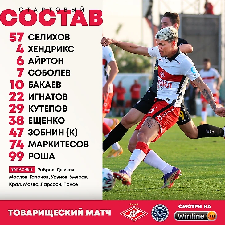 О СОСТАВЕ Как и днем ранее, когда «Спартак» встречался с солигорским «Шахтёром», в заявке не оказалось Жиго. Ничего серьезного с французским защитником не стряслось. Просто его решили поберечь из-за небольшого ушиба бедра. В начале матча на поле вышли в основном те, кто сыграл против «Шахтёра» только последние 20 минут. Необычная роль досталась Маркитесову: Дима составил пару Кутепову в центре защиты. Бакаев разместился на правом краю атаки, Роша — на левом.