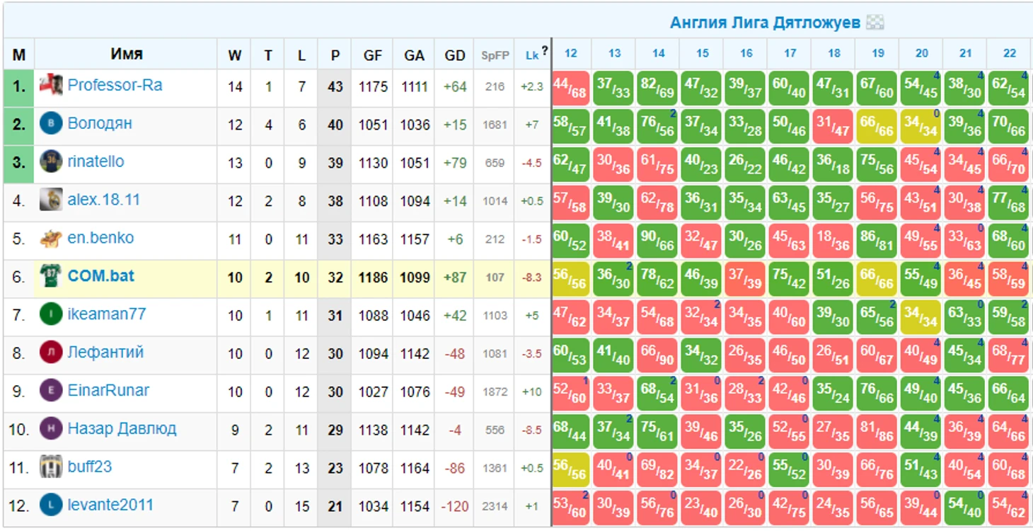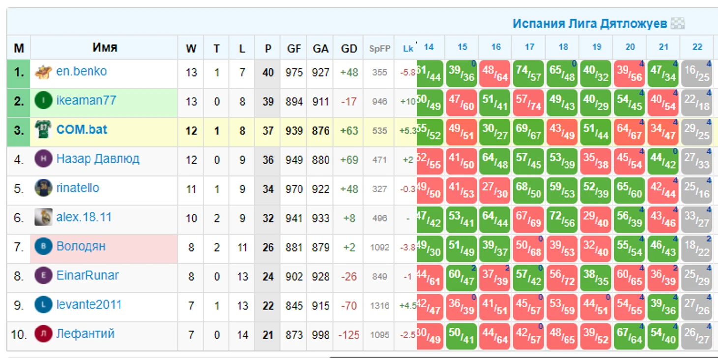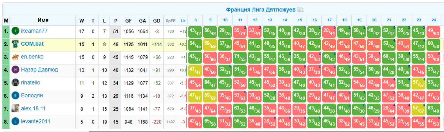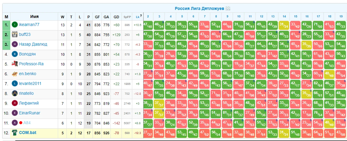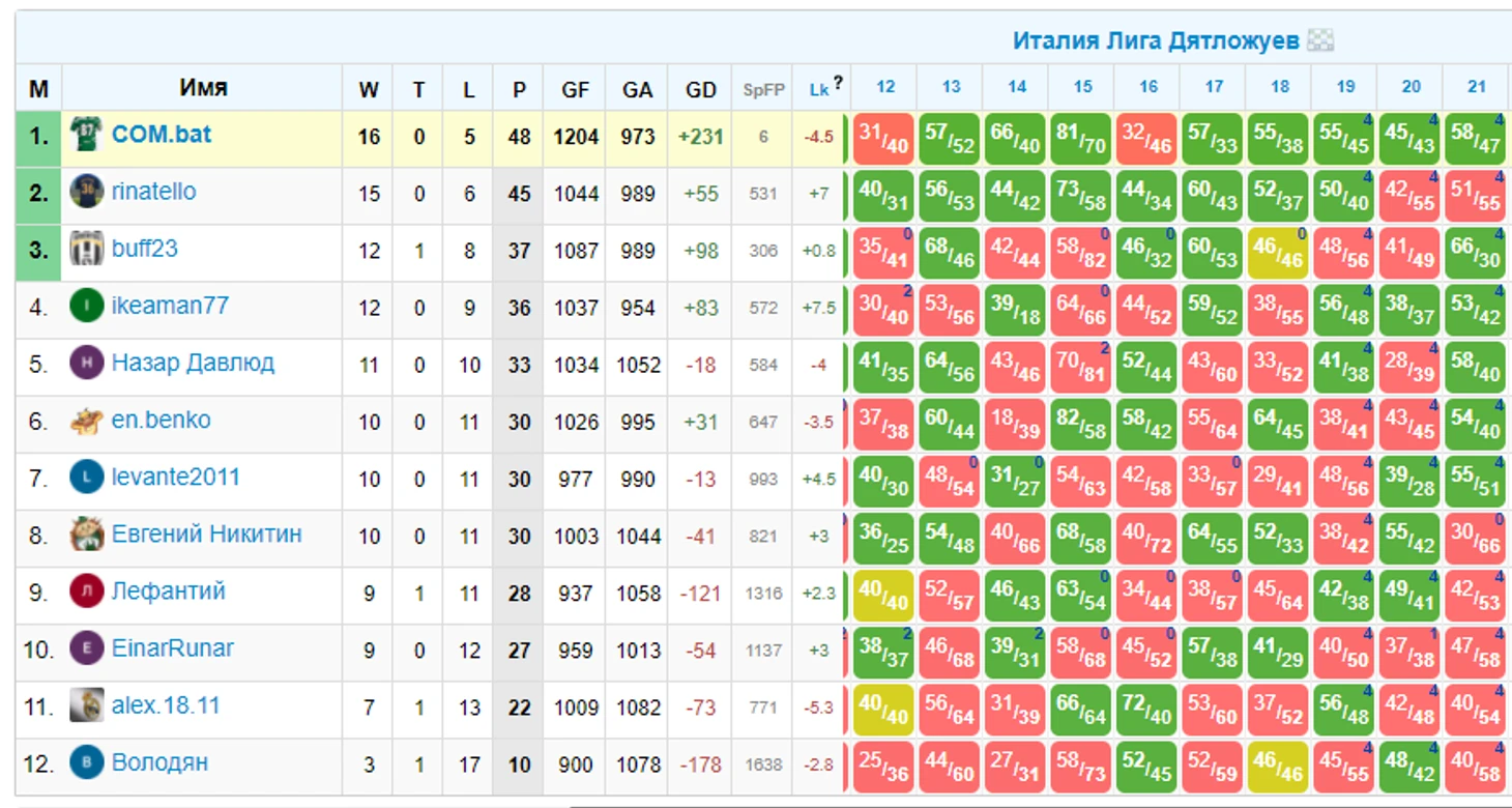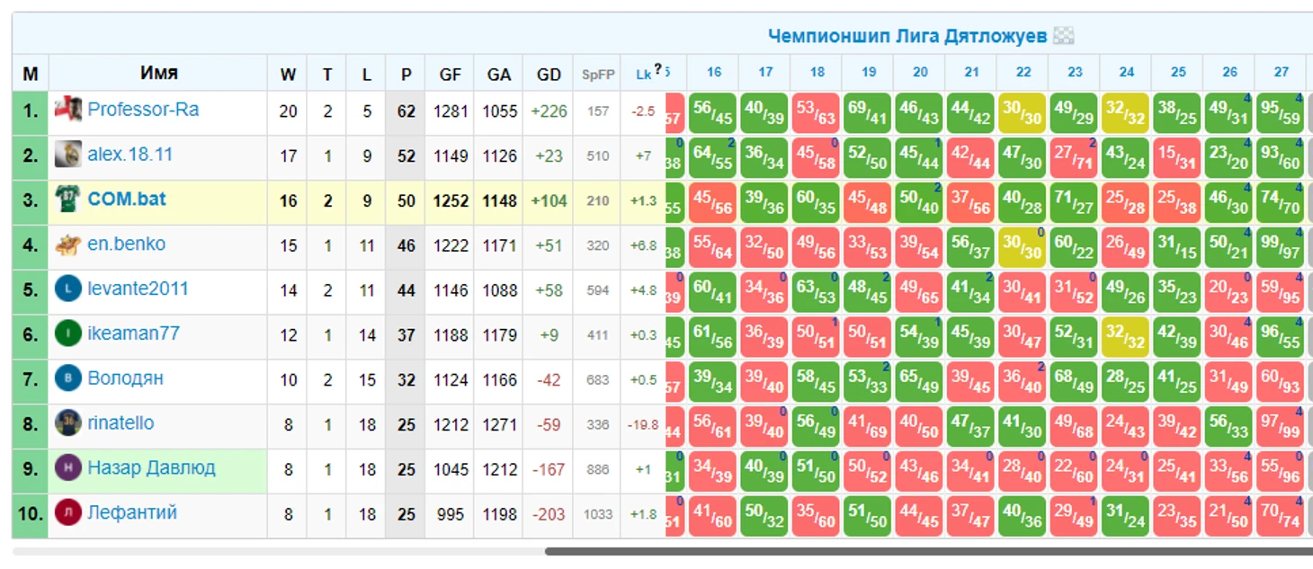 Тут мы играем до 27 тура включительно, казалось бы всего 21 очко в розыгрыше и сложно побороться за призы. А вот нет, регламент читать надо! Чтобы бороться за призы, нужно всего-то попасть в 5ку лучших. Ринат, давай серию из 7 побед и ты в игре ;)