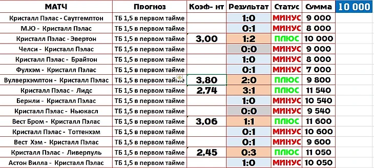 На сегодняшний день Кристалл Пэлас провел 23 игры в Англиской премьер лиги. Выше вы можете наблюдать за всей картиной связанной с первым таймом. Даже судя по этой картине, если бы вы ставили на гол в матче за 1,05 или чуть выше, то явно были бы в минусе. Если же заигрывать один мяч в первом тайме, то вы были бы в плюсе. Впрочем в этом вы можете убедится сами, глянув на таблицу приведенную ниже.