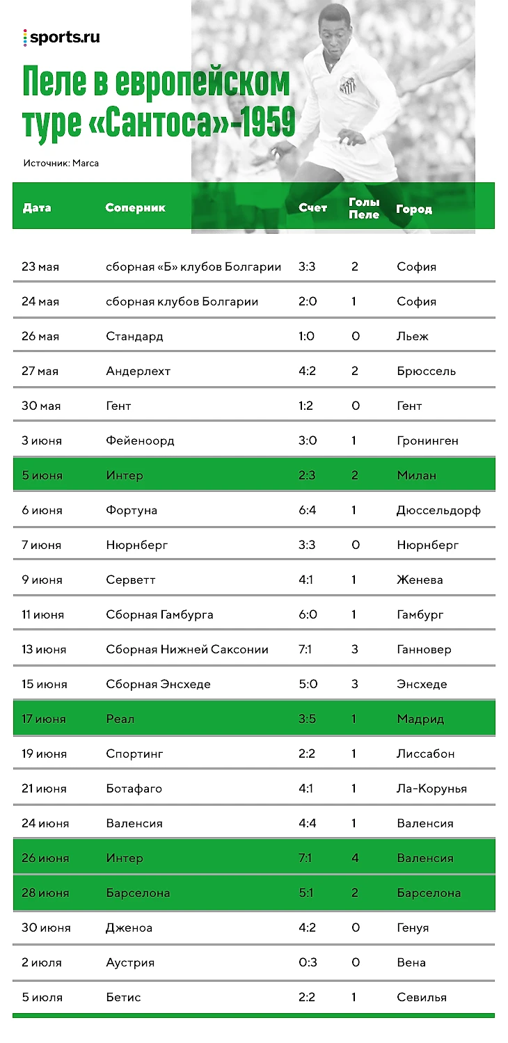 Звучит неубедительно, но важно понимать, что в случае с Пеле многие выставочные матчи отличались от тех, к которым мы привыкли. После победы на ЧМ-1958 молодой бразилец стал суперзвездой, но без соцсетей и со слабым освещением на ТВ у болельщиков из Европы было не очень много возможностей увидеть его игру.