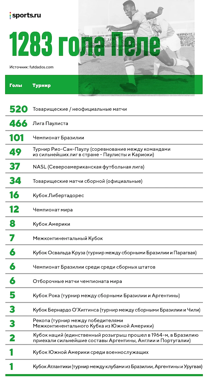 «Пеле забил 1091 гол за «Сантос». По сообщениям специализированной прессы, на его счету 643 гола в официальных матчах. При этом 448 голов, которые были забиты в товарищеских встречах, были вычеркнуты, будто бы они имеют меньшую ценность, чем другие.