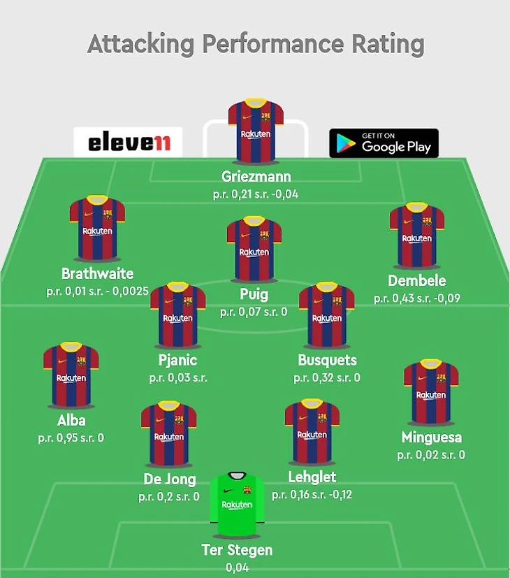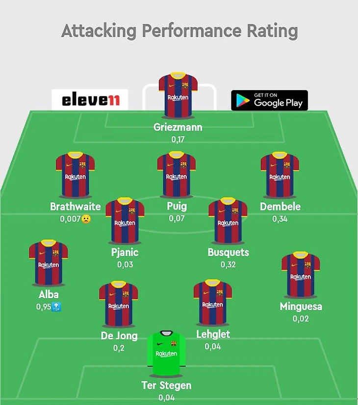 В защиту впишем Френки де Йонга. Куман собирался дать ему отдых, но травма Араухо спутала все карты. Уже на 7-й минуте голландец вышел на замену и занял место в центре обороны. Только в самой концовке, после выхода на поле Умтити, он ушел в центр. В защите Френки отыграл весьма неплохо, хоть и были позиционные ошибки. Также впечатление смазала карточка. Но в целом голландец был неплох, а заодно установил интересное достижение: стал первым игроком с сезона 2005/06 в Ла Лиге, выдавшим 100% точности передач после выхода на замену. 7,4.