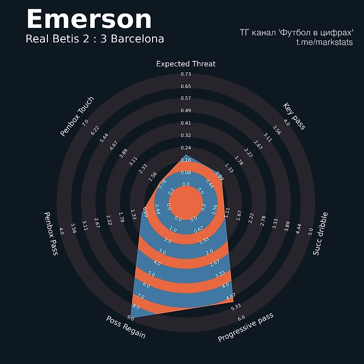 Отдельно хочется отметить Эмерсона. Он ведь наш, летом вернется в Каталонию, если не сглупят клубные боссы. Бразилец провел выдающийся матч — порвал на фланге Альбу, отдал ассист, сделал 39/40 точных передач и аж 9 раз возвращал владение (отборы и перехваты). Пожалуй, лучший игрок в составе бетикос и второй лучший в матче после Месси. 7,8.