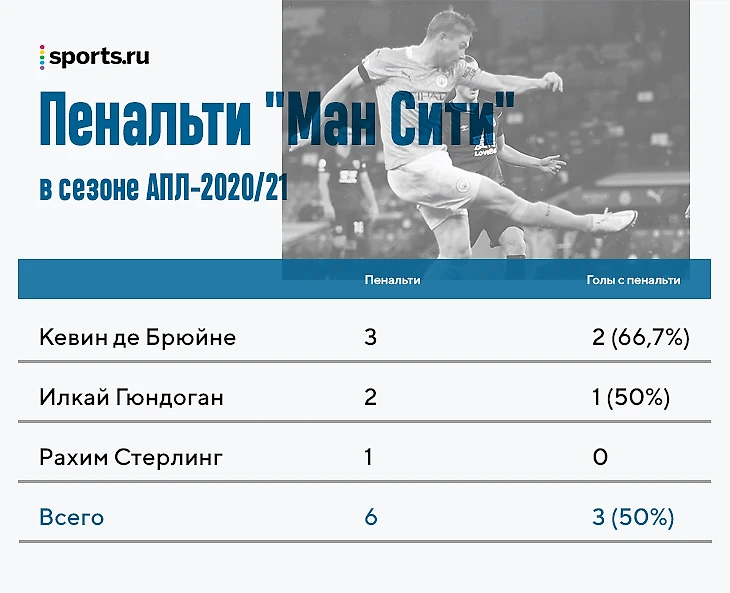 В этом сезоне «Сити» не забил в АПЛ три пенальти из шести (50%) – худший показатель с «Фулхэмом» (три из пяти). Причем не забивают все – Гюндоган стал уже третьим.