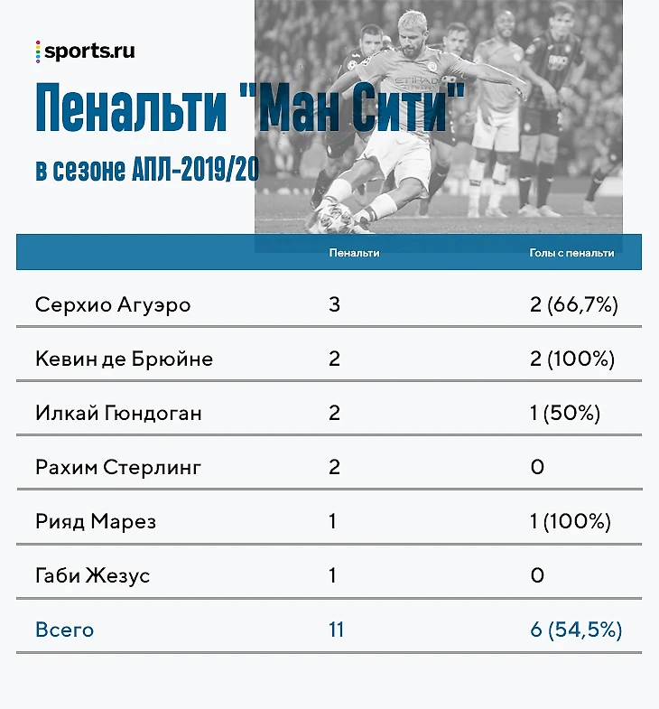 В прошлом сезоне Премьер-лиги «Сити» не забил 5 пенальти из 11 (процент реализации – 54,5%). А если учитывать все турниры, то 6 из 16 (62,5%).
