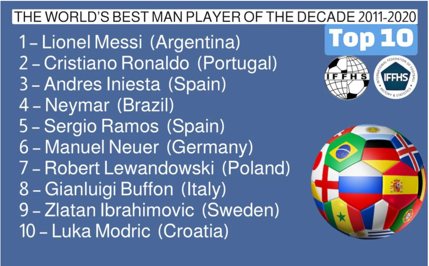 Международная федерация футбольной истории и статистики выкатила очередной бомбический рейтинг лучших игроков десятилетия с 2011 по 2020 год. Кратко это действо называется так: ребенок, ты кого больше любишь маму или папу? Примерно так. Если все же у вас, дорогие читатели, есть жесткое предпочтение, то напишите его в комментариях.