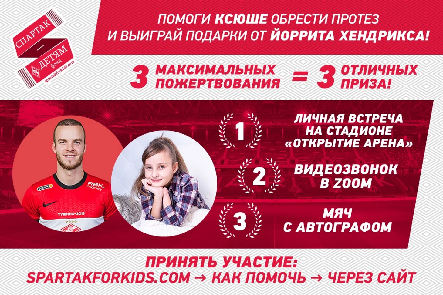Йоррит Хендрикс недавно присоединился к команде красно-белых, но уже с радостью помогает исполнять важные детские мечты! Голландский полузащитник «Спартака» приготовил три отличных подарка за три самых крупных пожертвования для Ксюши.