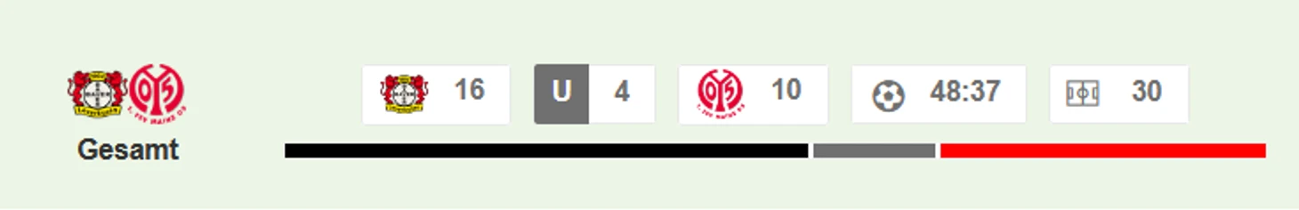 Леверкузен выиграл последние шесть матчей против гостей из Майнца. Это лучшая серия «аспириновых» против команд Бундеслиги;