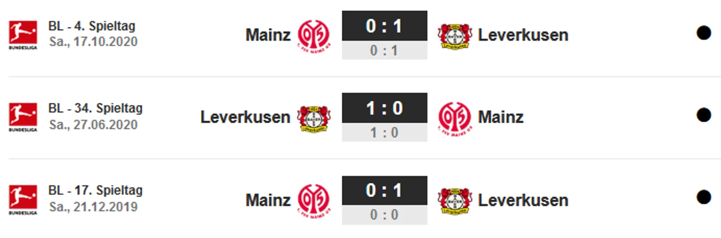 Последние три поединка Леверкузен выиграл у «Майнца» со счетом 1:0. Еще ни одно противостояние двух команд Бундеслиги не заканчивалось со счетом 1:0 четыре раза подряд;