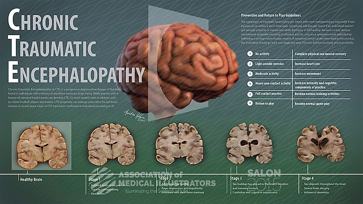 CTE (Chronic Traumatic Encephalopathy) – хроническая посттравматическая энцефалопатия. В переводе на русский это деменция, вызванная повторяющимися травмами головы. Считается, что из-за них возникают необратимые повреждения клеток мозга и связей между ними, в результате чего мозг буквально начинает усыхать, а умственные способности человека – угасать. Поначалу это едва заметные изменения – забывчивость, трудности при подсчете суммы покупок в магазине. Проще говоря, чем сложнее умственный труд, тем труднее он дается. Далее симптомы нарастают, словарный запас скудеет, фразы становятся односложными, а человек теряет постепенно способность выполнять самые простые действия самостоятельно.
