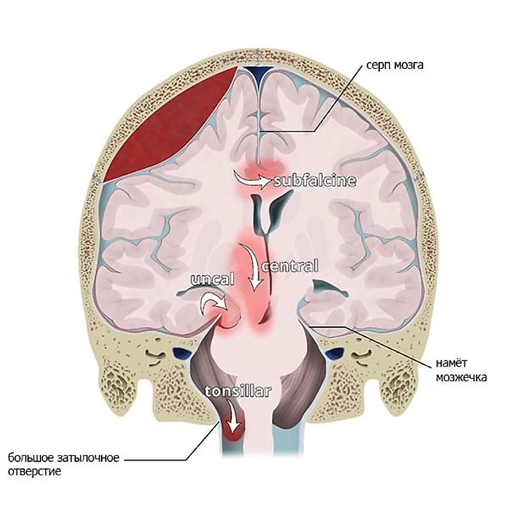 В этом случае сдавливаются участки мозга, находящиеся в этой области, а именно: центры дыхания и сердечного ритма. Вдобавок, из-за сдавления нарушается отток крови и ликвора от тканей мозга, из-за чего отек усиливается еще больше, а мозг перестает получать кислород и питательные вещества.